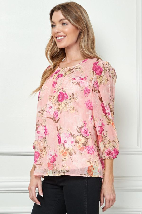 3/4 Knot Sleeve Front & Back Yoke Lined Blouse in Print Chiffon Yoryu with Varigated Stripe Lurex, beautiful floral print and colors complete its elegance.