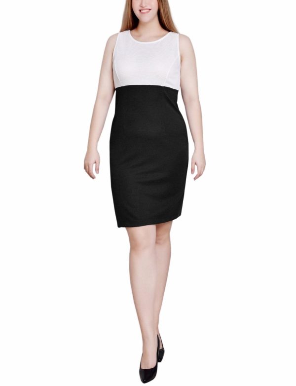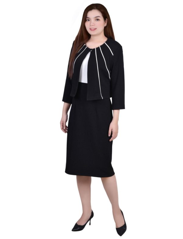 Featuring striking contrast piping accents, this sophisticated color-blocked dress pairs beautifully with a complementary 3/4 sleeve jacket, creating the perfect professional ensemble for your workplace wardrobe.