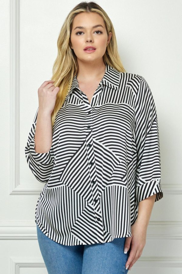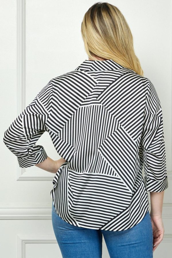 Elevate your wardrobe with this chic black-and-white striped blouse featuring a contemporary geometric design that transitions effortlessly from office wear to casual outings.