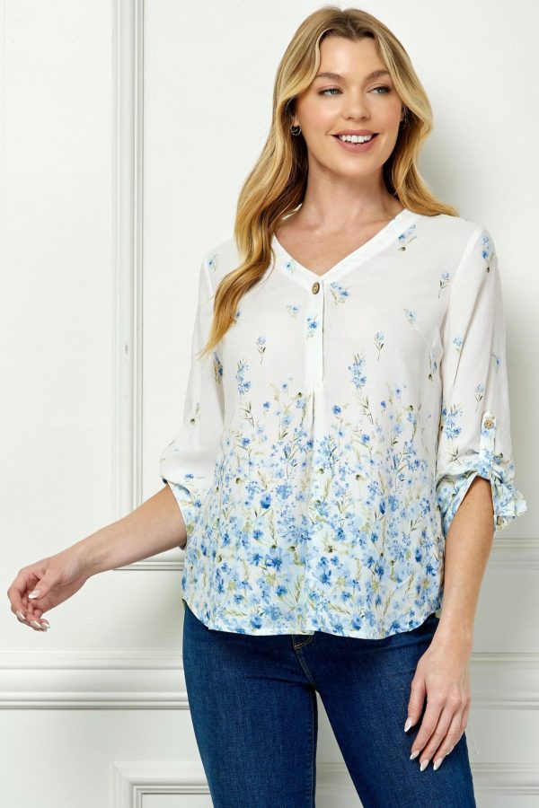 3/4 Button Tab Sleeve Big Button V-Neck Border Print Blouse in Border Print Poly Flex is a beautifully textured fabric featuring a fresh Spring Bloom print and vibrant colors, making it the perfect lightweight blouse for your spring and summer wardrobe.