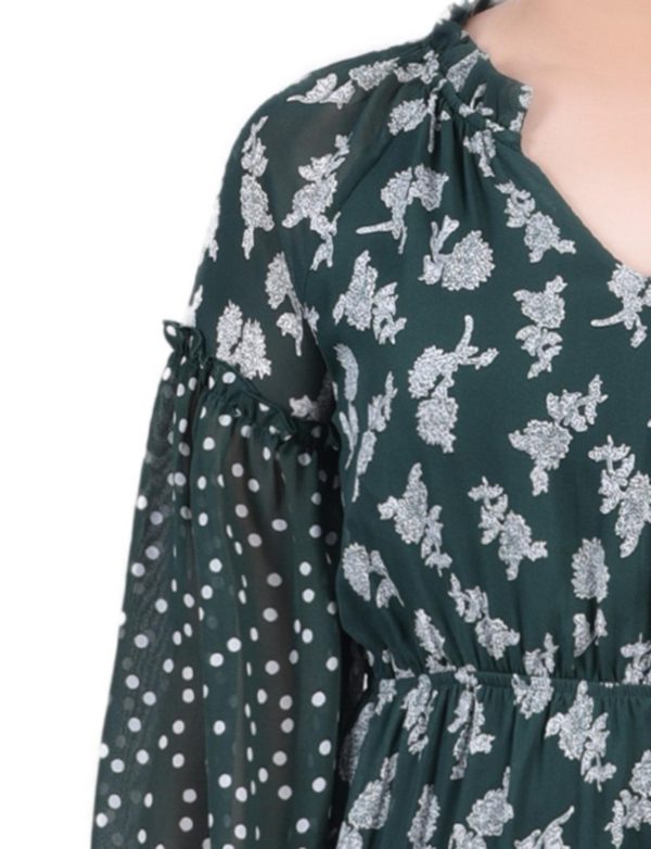 Celebrate your special moments in this tiered chiffon dress designed with combo print sleeves and a ruffled neckline.