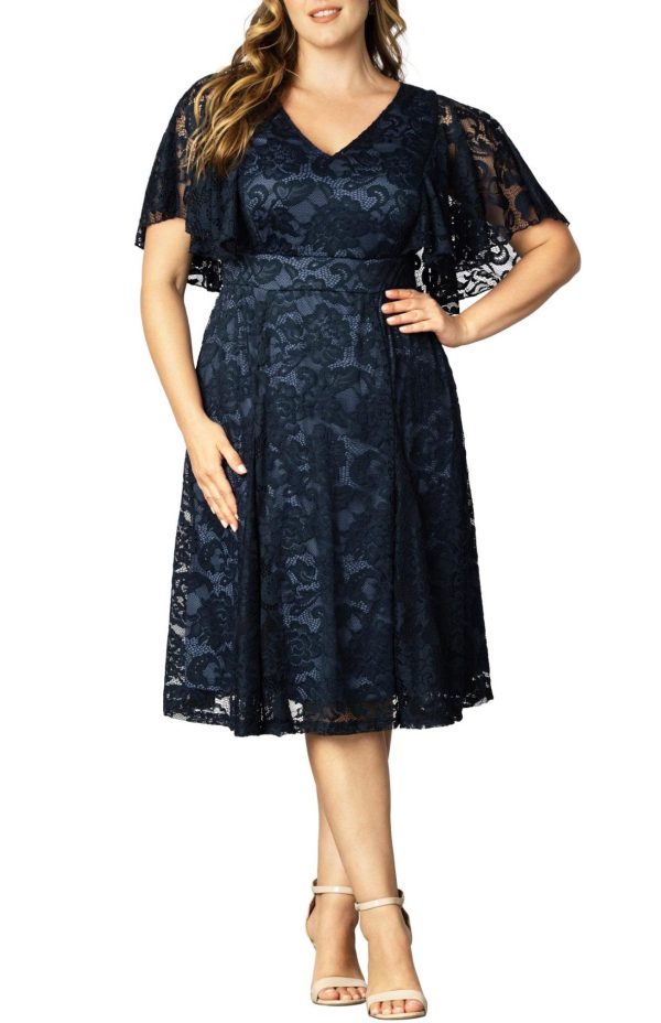 The Camille Lace Cocktail Dress features two-way stretch lace, slightly contrast lining, and princess seams for exceptional contouring and comfort. Godets in the skirt create beautiful movement while the statement-making draped sleeves provide elegant coverage and sophisticated style to this plus size formal lace dress.