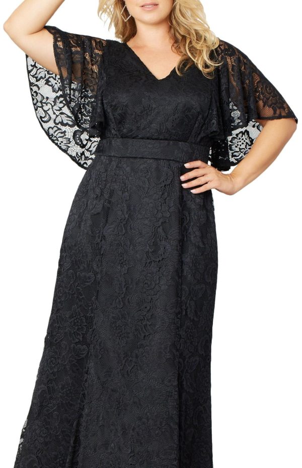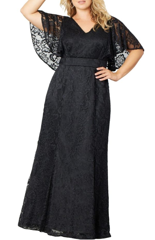 The Duchess Lace Evening Gown features elegant princess seams, a flattering V-neckline both front and back, a beautifully flared skirt, and statement flutter sleeves. This stunning plus size formal gown delivers exceptional elegance, making it perfect for wedding celebrations, mother of the bride/groom occasions, and sophisticated black tie events.