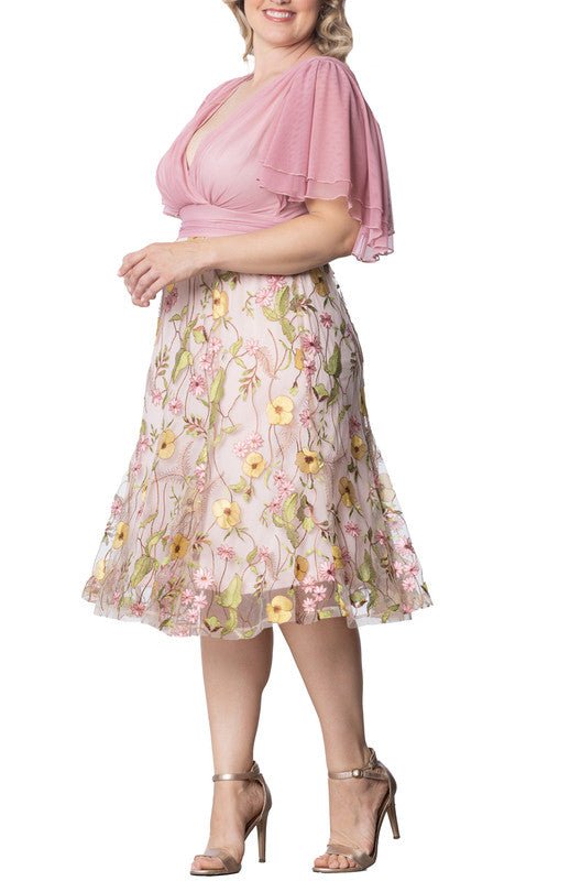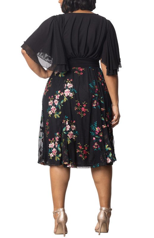 The Lillian Embroidered Cocktail Dress delivers stunning sophistication for plus size occasions, featuring a sleek black mesh bodice, elegant surplice neckline, beautifully layered flutter sleeves and a comfortably shirred waistband. The exquisite floral embroidered skirt incorporates graceful godets for captivating movement that turns heads.