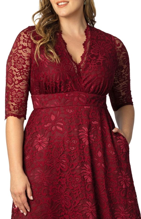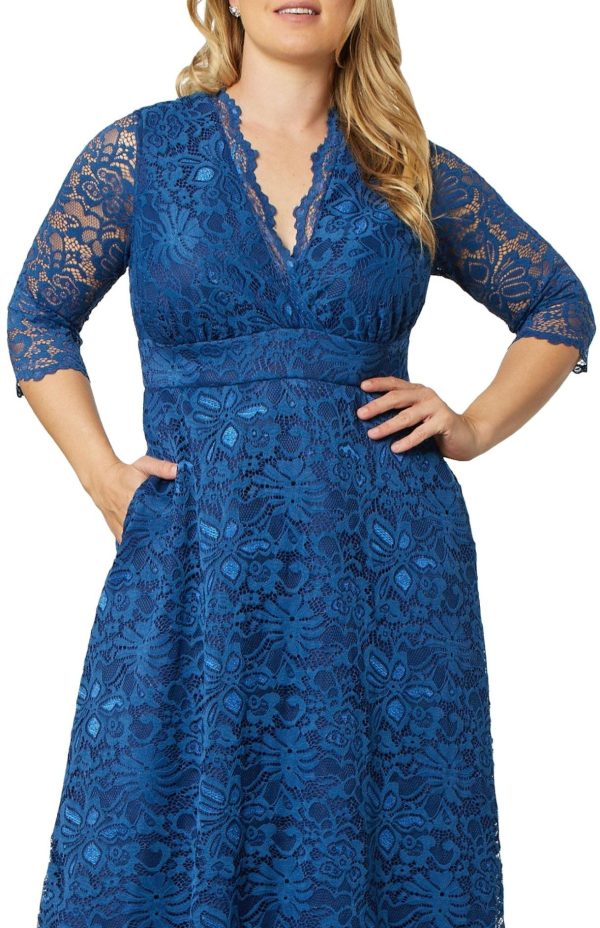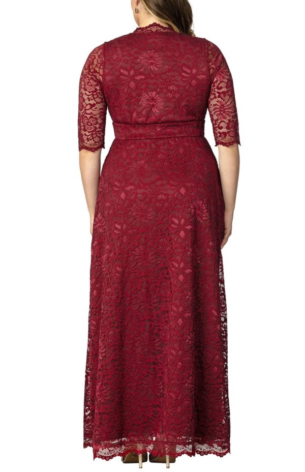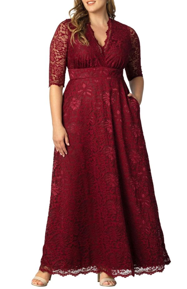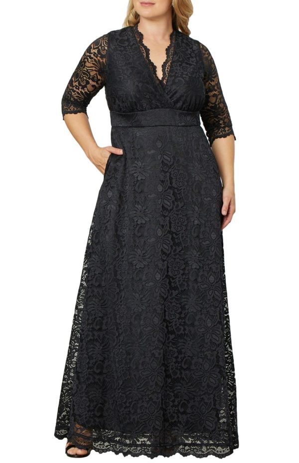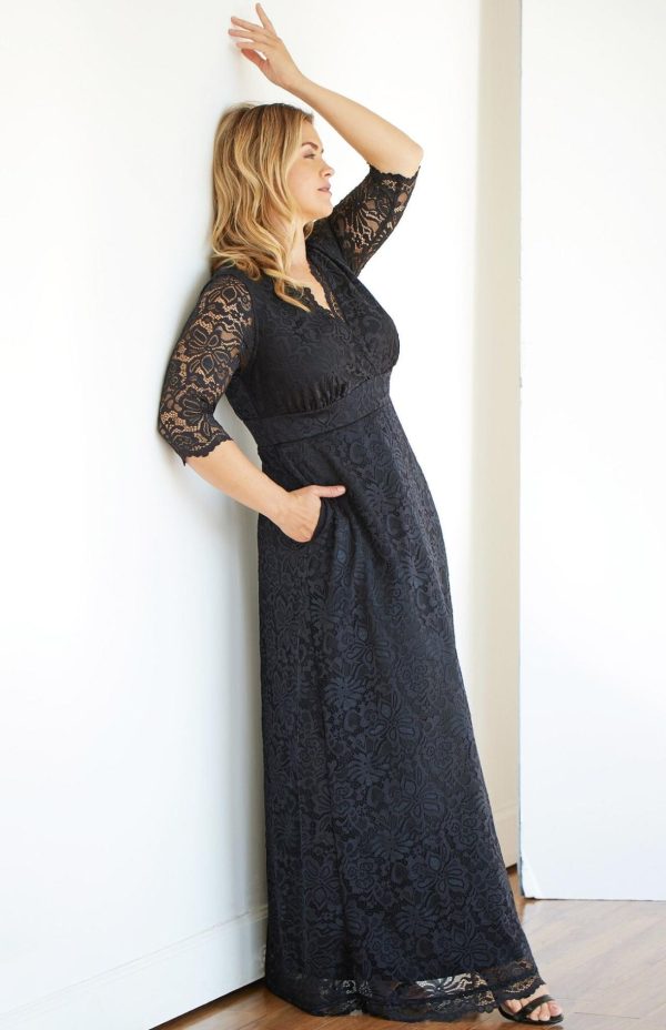 Elevate your special occasion style with our stunning Maria Lace Evening Gown, featuring exquisite stretch floral scalloped lace craftsmanship. This elegant long formal gown showcases a flattering A-line silhouette with a sophisticated surplice neckline, convenient side pockets, and graceful 3/4 sleeves. Perfect for making a memorable impression at weddings, galas, formal events, or as mother of the bride/groom attire.