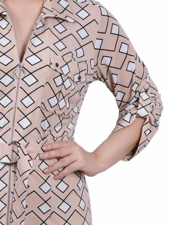 With roll-tab sleeves, a matching belt, and a zip front detail, this 70’s inspired dress is perfect for any sophisticated occasion.