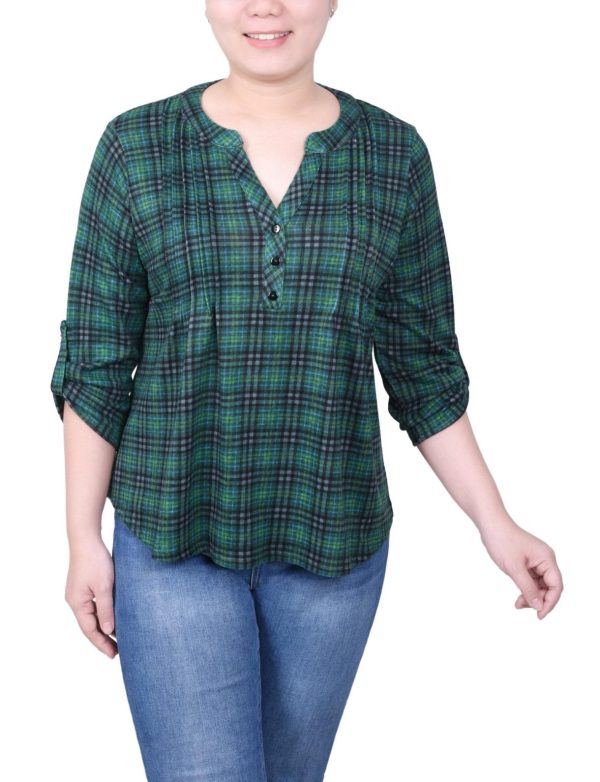 Featuring elegant front pintucks and a sophisticated Y-neckline, this versatile roll tab top offers exceptional flattery for all body types and transitions effortlessly from casual to dressy occasions.