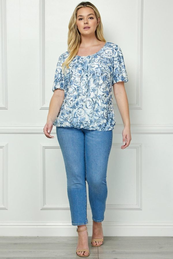 Short puff sleeve pleat scoop neck fully lined bubble blouse in print poly/spandex cord stripe mesh with sophisticated floral print design and color, creating a versatile blouse perfect for professional settings or evening occasions.