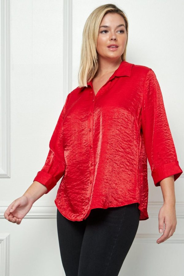 3/4 Notch Sleeve Button Front Shirt Top in Solid Rayon/Nylon Satin Shimmer Air Flow, featuring a luminous finish that beautifully catches the light. Perfect for holiday gatherings and special occasions, this versatile blouse layers effortlessly under blazers or jackets for polished daytime-to-evening style.
