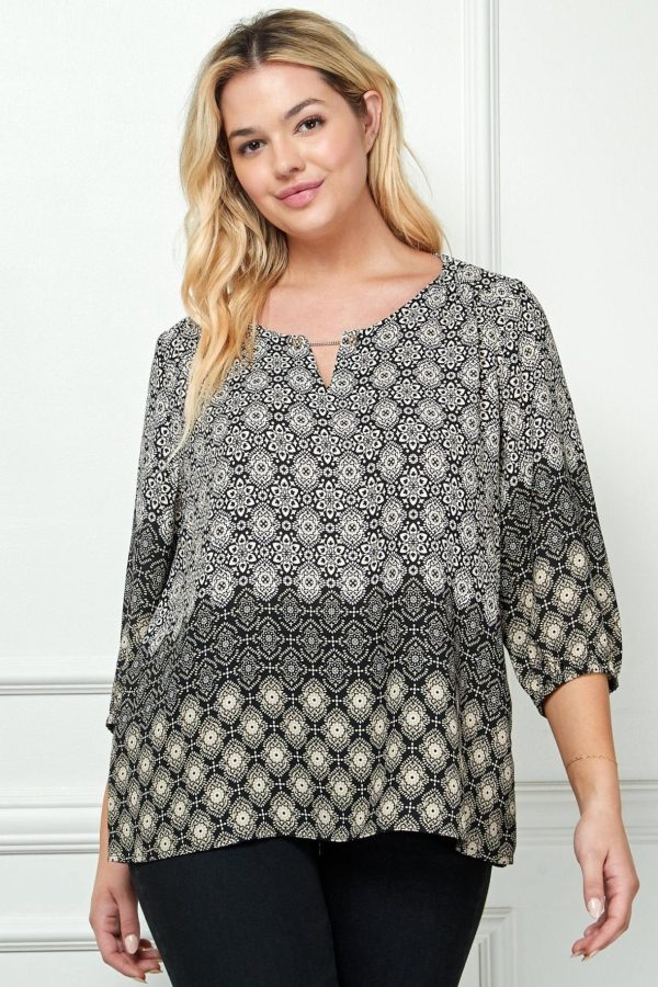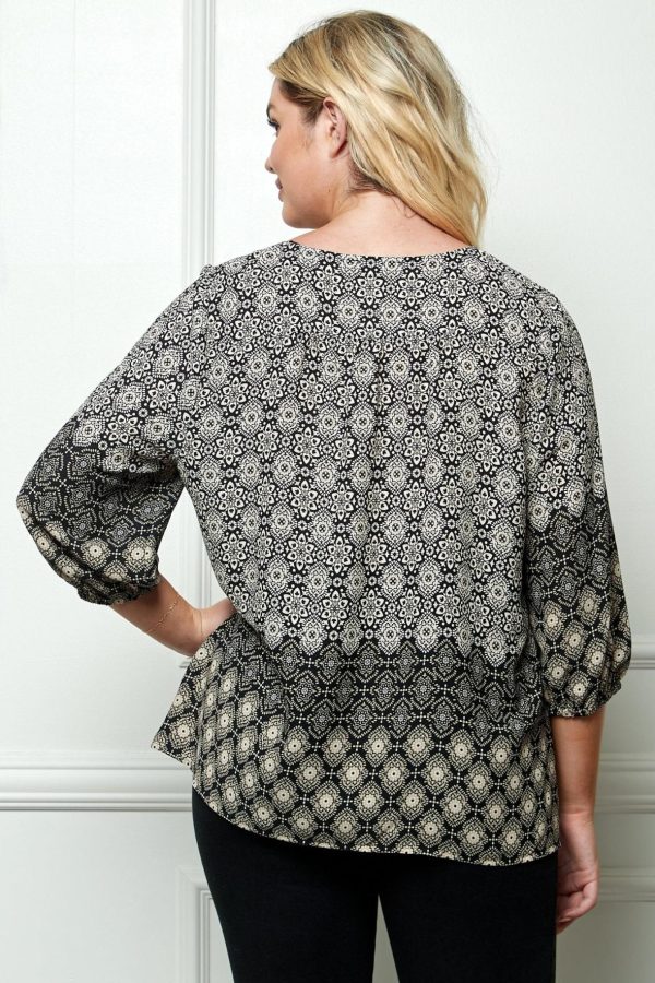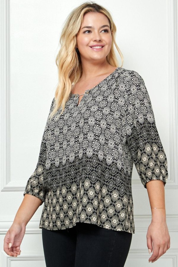Elevate your everyday style with this beautifully designed plus size top featuring an eye-catching border print that adds a touch of sophistication to your wardrobe. The flattering 3/4 sleeve length provides versatile coverage while maintaining a breezy, comfortable feel. Perfect for both casual outings and dressed-up occasions, this top offers exceptional comfort with its thoughtfully crafted fit that moves with you throughout your day.