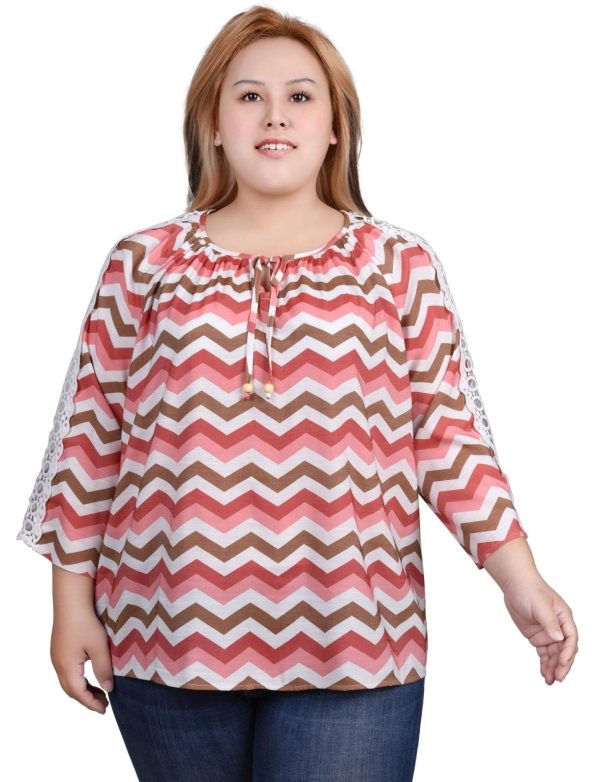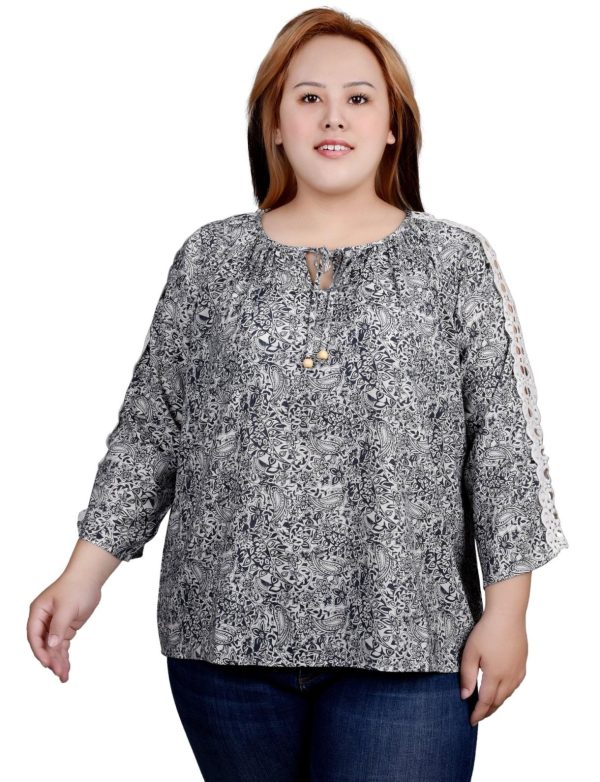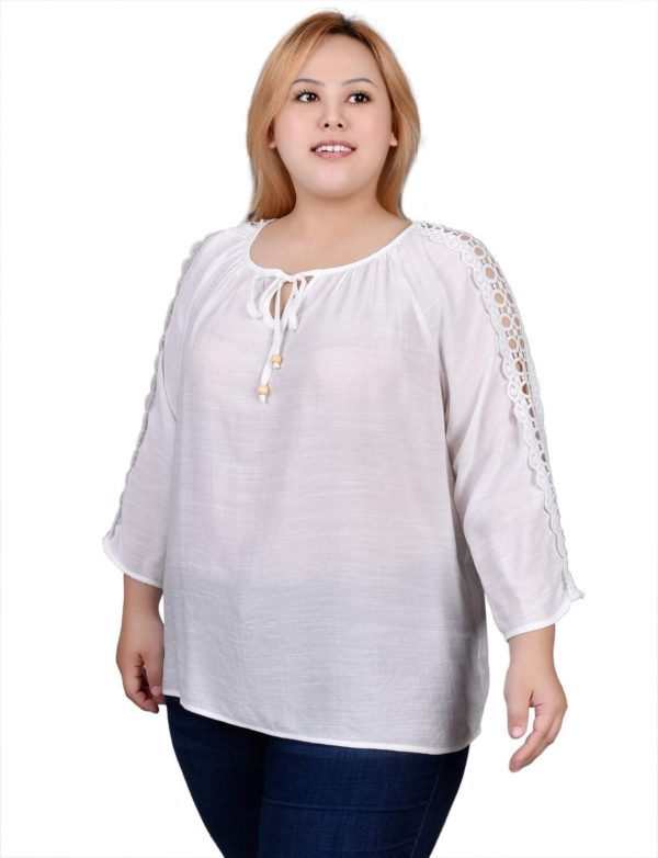 Elevate your style with exquisite craftsmanship on this slubbed woven top featuring delicate crochet-trimmed sleeves and an elegant gathered neckline with decorative beaded ties.