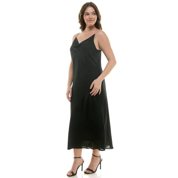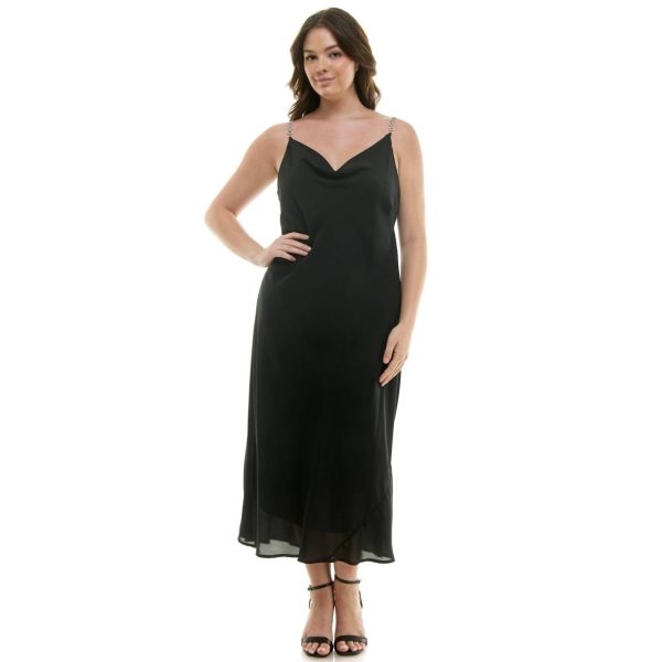 Elevate your special occasion style with this stunning black cowl neck dress featuring a detachable rhinestone chain strap. Crafted from premium solid poly wool dobby fabric, this sophisticated piece offers effortless glamour and versatility. The removable strap design ensures easy care and multiple styling options for your most memorable events.