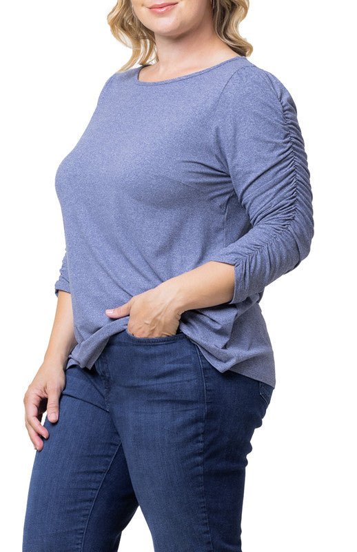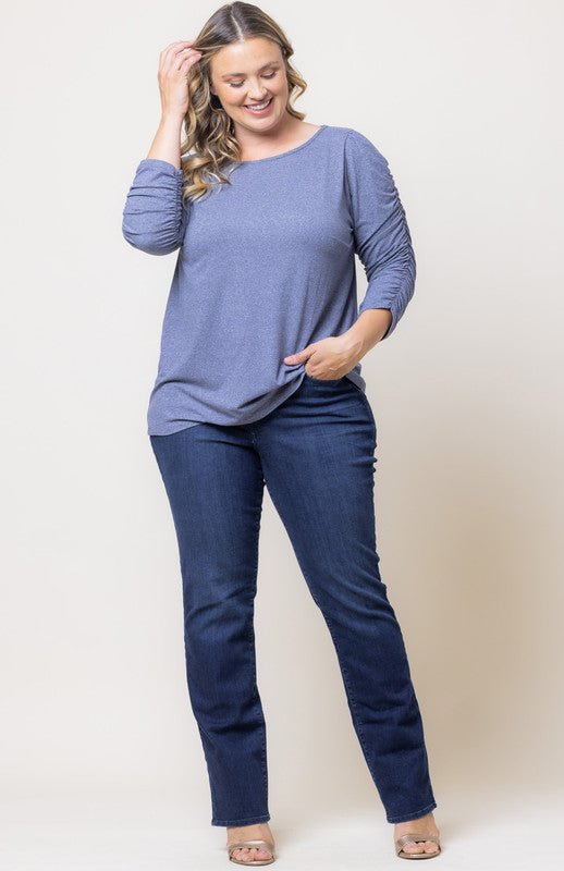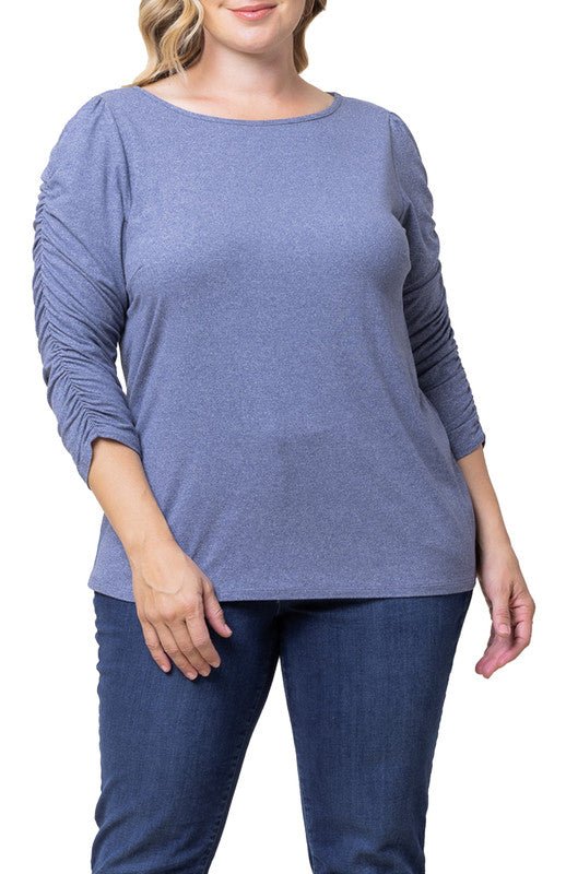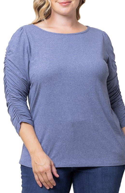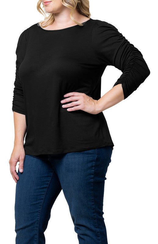 Take your everyday style to the next level with the plus size Reverie Ruched Top. This easy fit style features a flattering boat neckline and 3/4 length ruched sleeves.