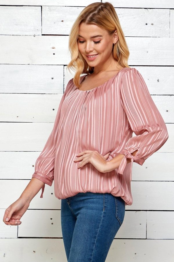 Elevate your everyday style with this effortlessly chic Roz & Ali blouse that pairs perfectly with your favorite denim. The satin stripe design adds a touch of luxury, while the adjustable tie sleeves create a flattering silhouette. Designed with comfort in mind, this versatile top transitions seamlessly from casual daytime outings to evening events. The soft pink hue offers a feminine touch that complements any wardrobe.