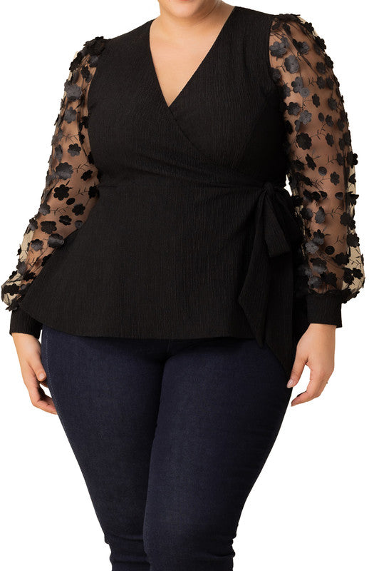 Wrap yourself in elegance with the Plus Size Scattered Petals Long Sleeve Wrap Top. This plus size blouse features a true wrap design that flatters your curves, while sheer mesh long blouson sleeves adorned with delicate 3-D flowers add a romantic touch. A crossover V-neckline and flowy peplum create an effortlessly feminine silhouette, finished with cuffed sleeves for a polished look.