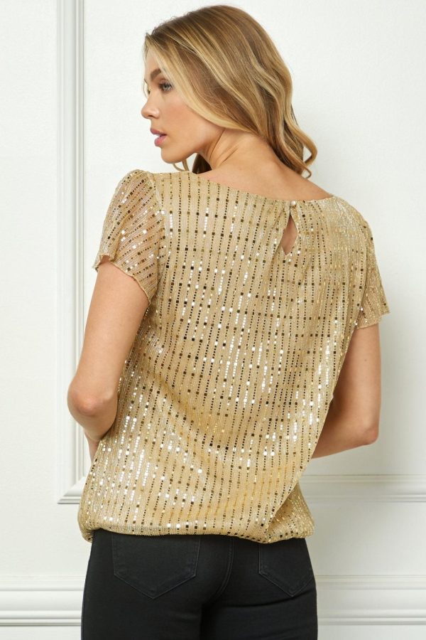 Short Flutter Sleeve Bubble Blouse in Solid Pleated Poly Yoryu Cross Dye Moonlight w/ Hologram Sequins, an eye-catching lined blouse designed to make you shine at any special occasion or celebration.