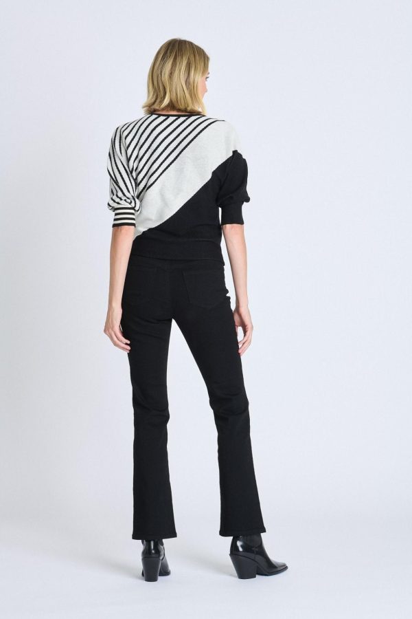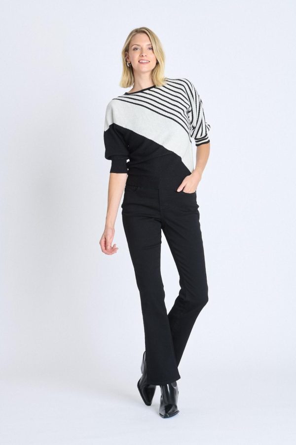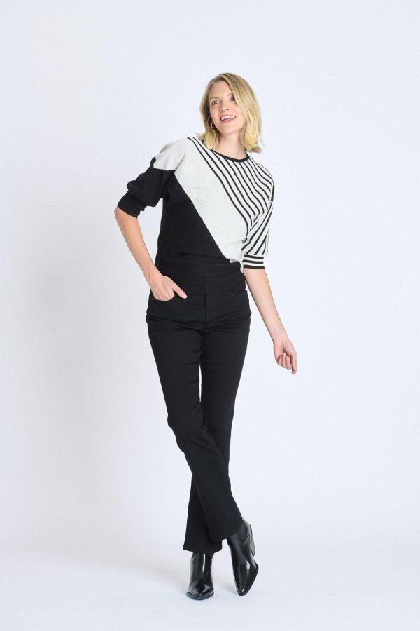 Elevate your daily wardrobe with our contemporary Striped Color Block Dolman Sweater in classic Black and White. This fashion-forward piece combines striking color blocking with an intentionally relaxed dolman sleeve silhouette, delivering a modern, flattering fit that transitions seamlessly from casual jeans to polished trousers.