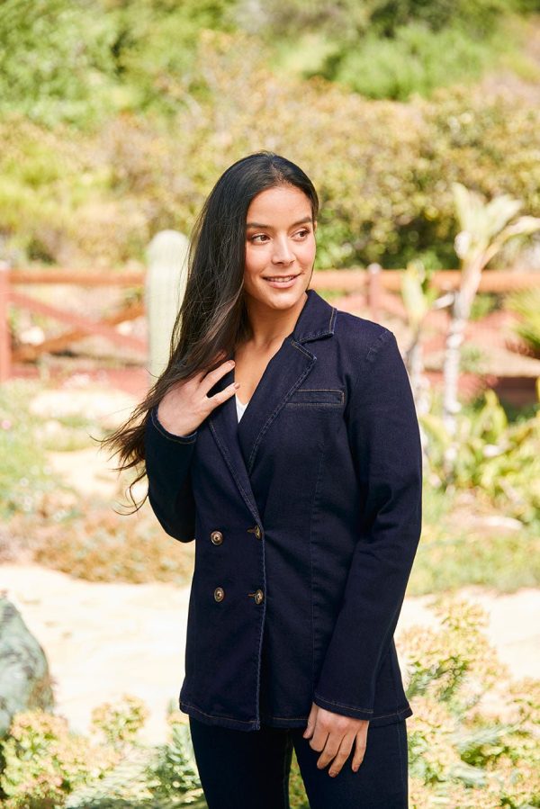 Constructed from premium denim fabric, this blazer features a deep dark wash that brings refined elegance to any ensemble. The tailored silhouette enhances your natural shape, while the classic notched lapel maintains timeless appeal. It’s the ultimate transitional piece that moves seamlessly from daytime professional to nighttime chic.
