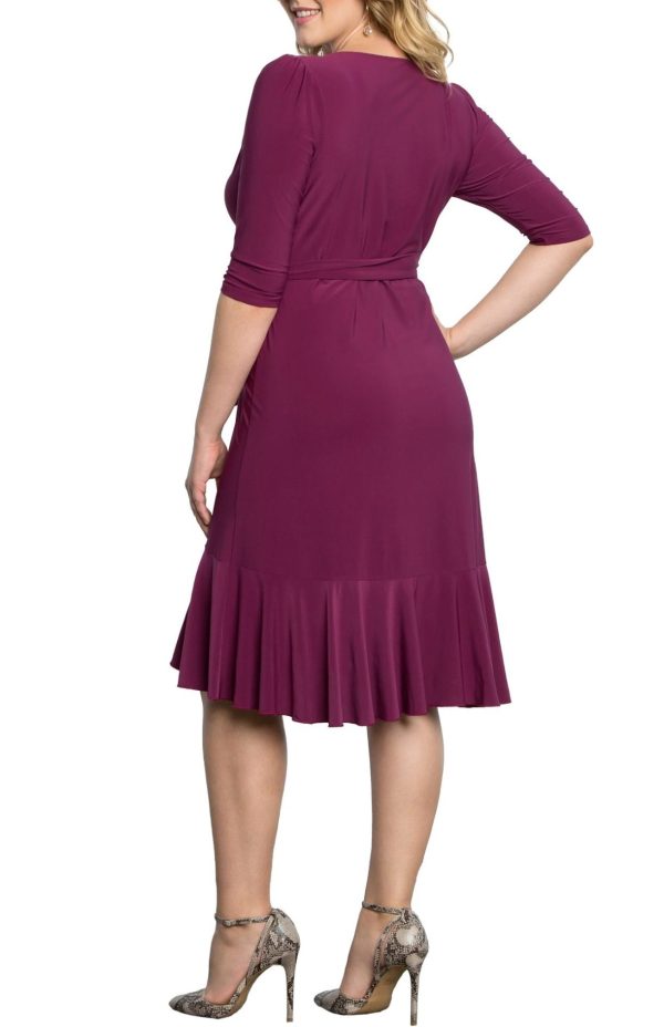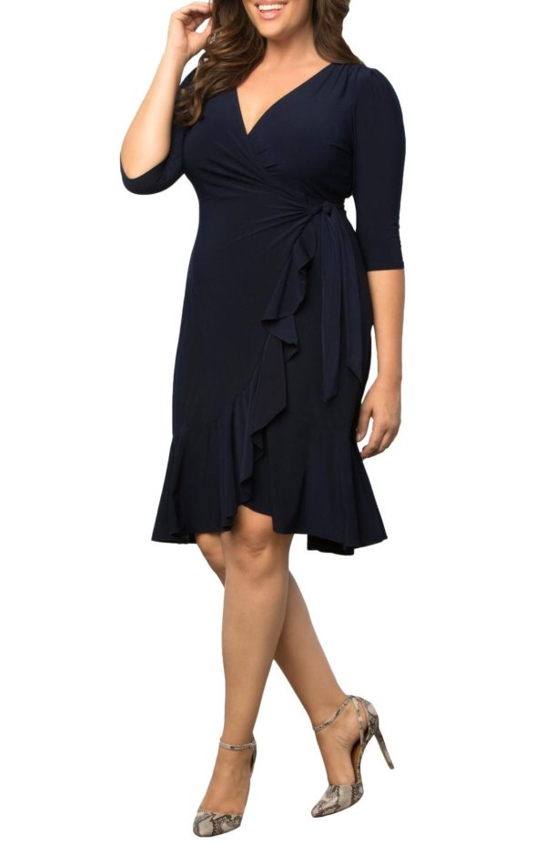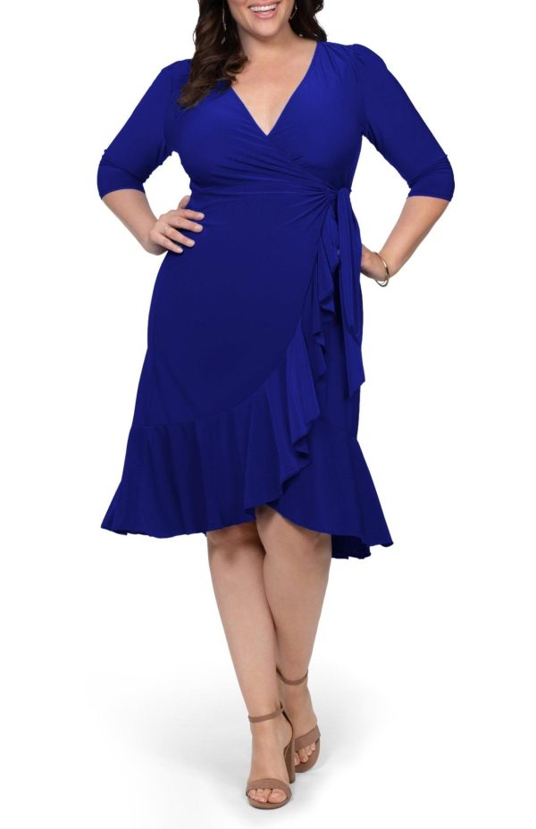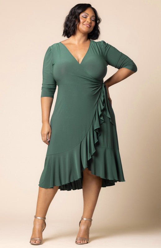 The Whimsy Ruffled Midi Wrap Dress showcases elegant cascading flounces along the skirt and hemline. This versatile wrap design offers customizable coverage with beautifully tailored 3/4 length sleeves. Ideal for cocktail parties, special events, professional settings, and wedding guest attire. Available in both regular and plus sizes for the perfect fit.