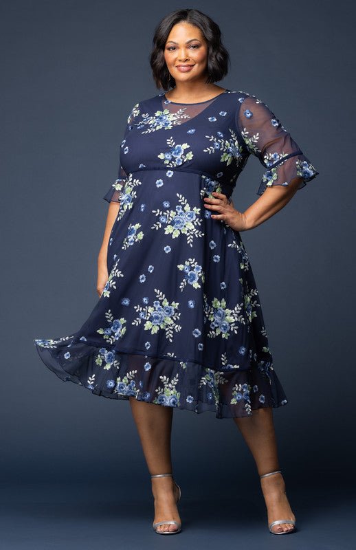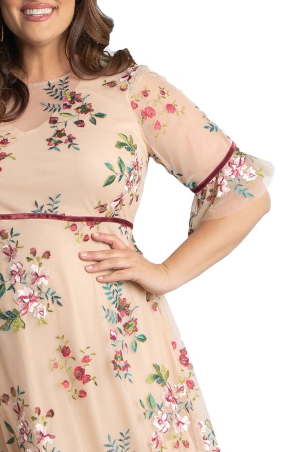 The Wildflower Embroidered Floral Mesh Dress is adorned with velvet trim touches, playful flounces, an A-line silhouette, and lined bodice and skirt. A perfect midi cocktail dress for any special occasion or semi-formal or formal party and a wedding guest favorite. Available in women’s plus sizes.