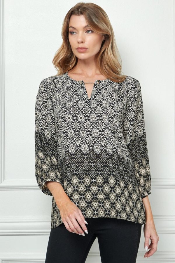 This chic top showcases an eye-catching border print design along the hemline and cuffs, creating an elevated style statement. The elastic sleeves ensure all-day comfort and freedom of movement, making it both fashionable and practical. The sophisticated chain trim neckline adds a refined finishing touch to your ensemble.