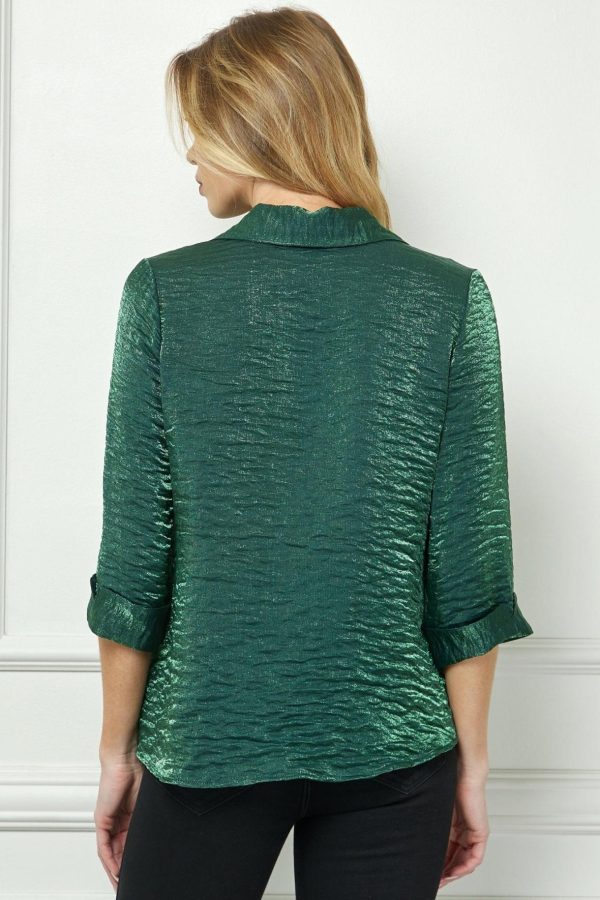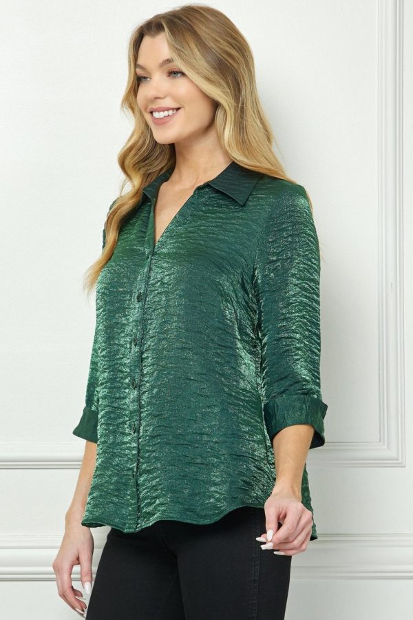 3/4 Notch Sleeve Button Front Shirt Top in Solid Rayon/Nylon Satin Shimmer Air Flow, featuring a luminous finish that beautifully catches the light. Perfect for holiday gatherings and special occasions, this versatile top layers effortlessly under blazers or jackets for polished daytime-to-evening style.