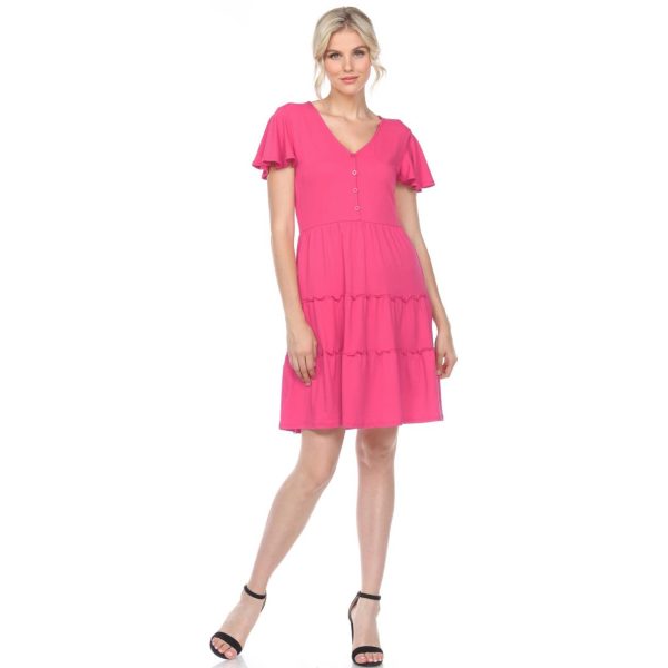Our flouncy tiered design gives this midi dress a simple but elegant look. The easy, breezy style is what makes if a perfect casual wear on hot days. The loose fit will compliment and flatter all body types. It features a V-neckline, a faux button down front and flutter sleeves.