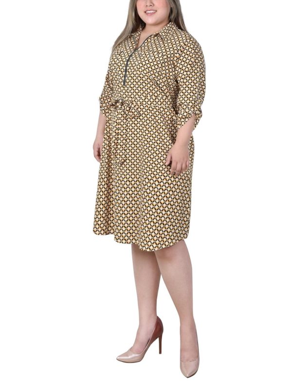 This contemporary shirtdress features a convenient front zipper closure and stylish roll tab sleeves. The adjustable self-tie belt creates a flattering silhouette that completes your polished look.